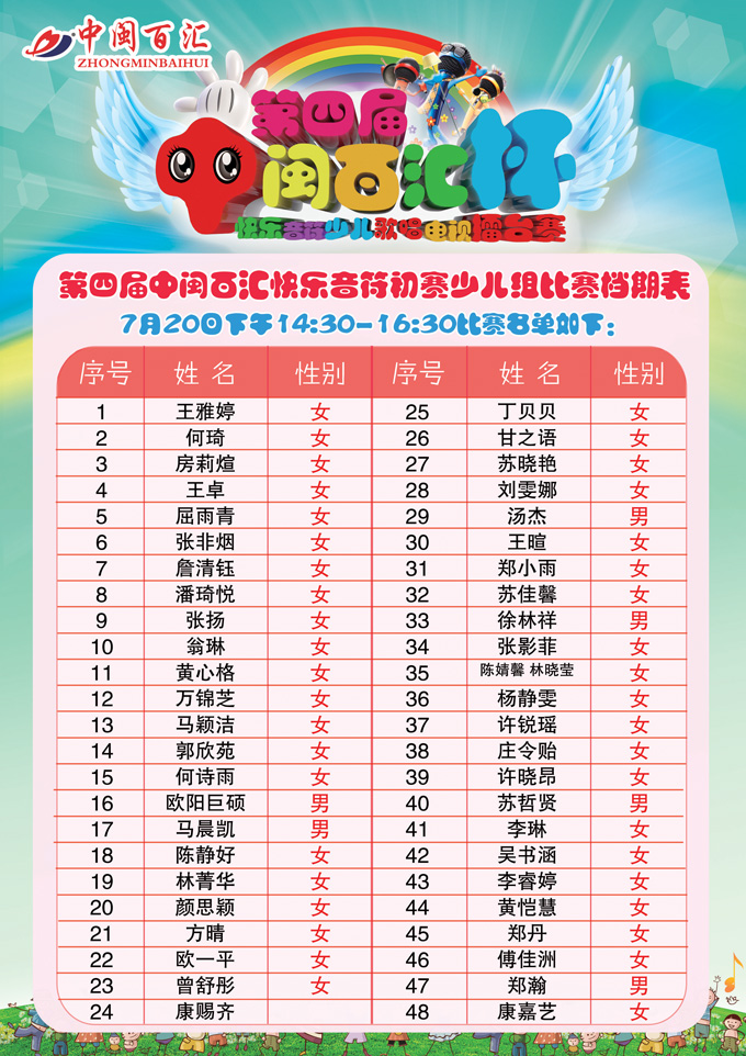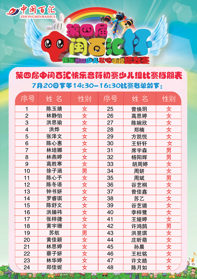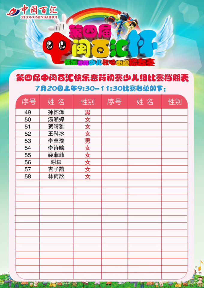第四届快乐音符赛程表-少儿组(7月20日)